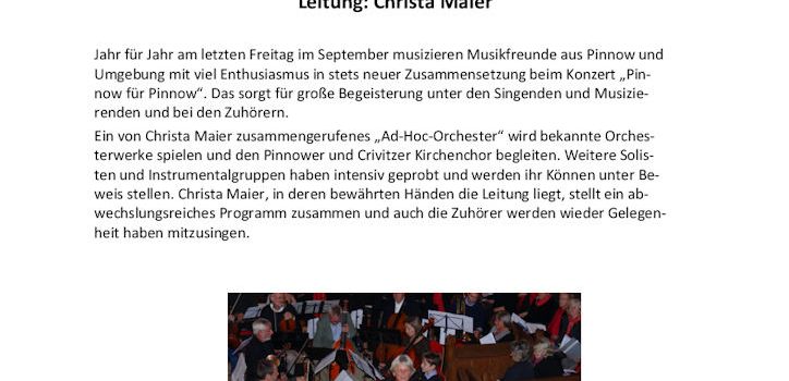 Instrumentalisten und Vocalisten aus Pinnow und Umgebung werden unter der bewährten Leitung von Christa Maier bekannte Stücke spielen und singen. Und das abwechslungsreiche Programm gibt dem Publikum wieder beste Gelegenheiten des gemeinsamen Gesangs.
